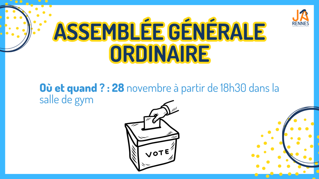 Vous êtes invité(e) à participer à notre Assemblée Générale Extraordinaire suivi de l’Ordinaire le : Vendredi 28 Novembre 2025 à 19h Emargement à partir de 18h30 Ordre du jour AGE : Ordre du jour AGO : Nous vous proposons de partager un buffet à l’issue de l’assemblée générale et pour la bonne organisation de cette soirée nous